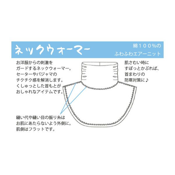 販売になる度に購入しています。 セーターの首元がチクチクするので、冬は毎日つけています。 夜眠るときも、つけていると、喉の保護になり気持ちよいです。 なんといっても、胸や後ろの首の下のあたりまで、布があるので、洋服ですれて、肌が痒くなる事がなくなりました。 これからも色のバリエーションを楽しみにしています。