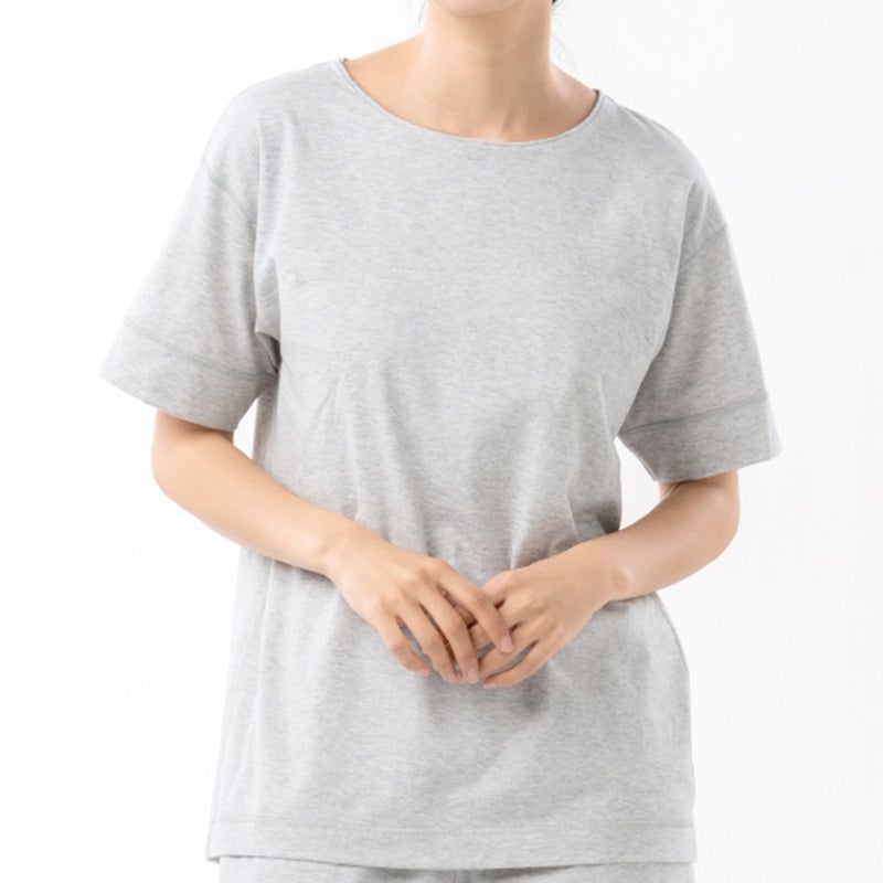 バスト部分に薄手のパットを内蔵し、ブラなしでは気になるトップの透け感を軽減してくれるTシャツです。