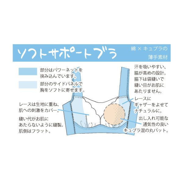 バストを柔らかく包み込むノンワイヤーのソフトブラ。