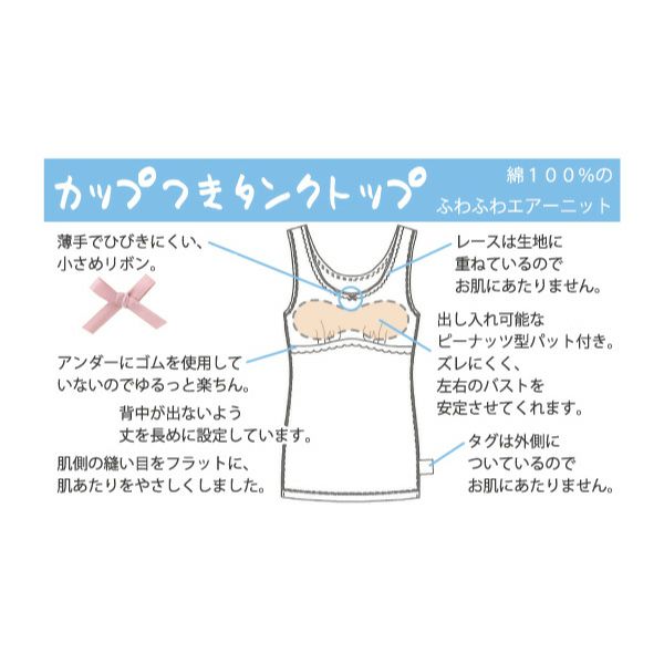 アンダーにゴムを使用していない、ゆるっと楽ちんなカップ付きタンクトップ。