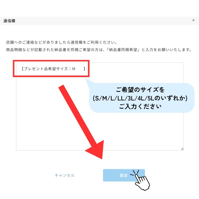 ご注文時の通信欄に、ご希望のサイズ(S/M/L/LL/3L/4L/5Lのいずれか)をご記入ください。